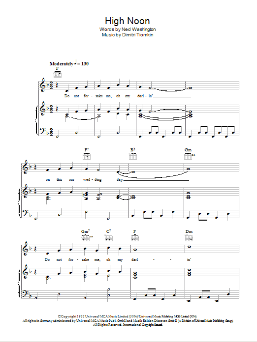 Download or print Frankie Laine High Noon sheet music, chords and digital score arranged for Piano, Vocal & Guitar Chords. This Film/TV score includes 3 page(s).