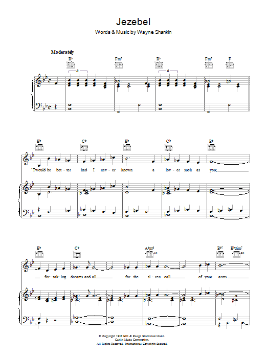 Download or print Frankie Laine Jezebel sheet music, chords and digital score arranged for Piano, Vocal & Guitar Chords. This Pop score includes 7 page(s).