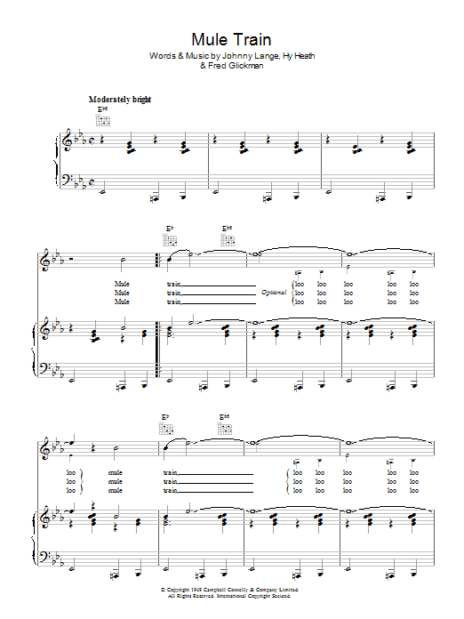 Download or print Frankie Laine Mule Train sheet music, chords and digital score arranged for Piano, Vocal & Guitar Chords. This Standards score includes 5 page(s).