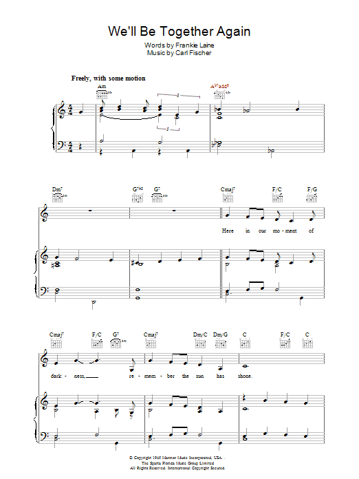 Download or print Frankie Laine We'll Be Together Again sheet music, chords and digital score arranged for Real Book – Melody & Chords – Bass Clef Instruments. This Jazz score includes 1 page(s).