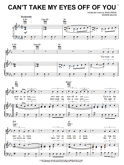 Download or print Frankie Valli & The Four Seasons Can't Take My Eyes Off Of You (from Jersey Boys) sheet music, chords and digital score arranged for Piano & Vocal. This Love score includes 7 page(s).