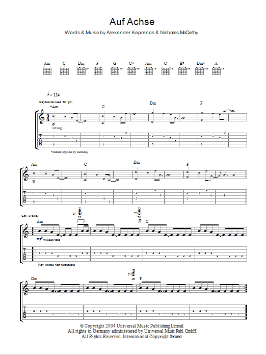 Download or print Franz Ferdinand Auf Achse sheet music, chords and digital score arranged for Guitar Chords/Lyrics. This Rock score includes 2 page(s).