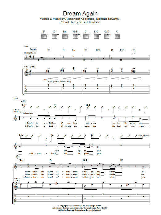 Download or print Franz Ferdinand Dream Again sheet music, chords and digital score arranged for Guitar Tab. This Rock score includes 3 page(s).