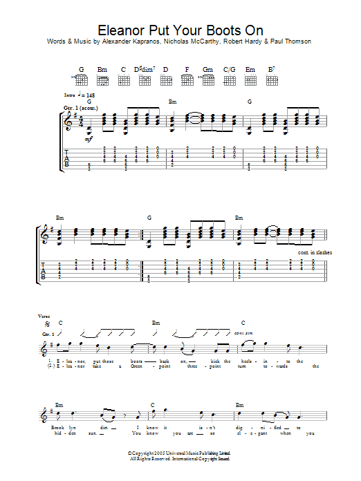 Download or print Franz Ferdinand Eleanor Put Your Boots On sheet music, chords and digital score arranged for Guitar Chords/Lyrics. This Rock score includes 2 page(s).