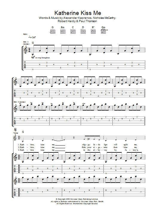 Download or print Franz Ferdinand Katherine Kiss Me sheet music, chords and digital score arranged for Guitar Tab. This Rock score includes 6 page(s).