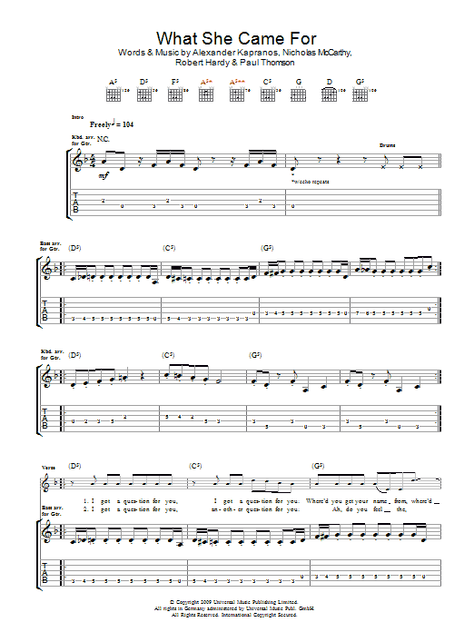 Download or print Franz Ferdinand What She Came For sheet music, chords and digital score arranged for Guitar Tab. This Rock score includes 5 page(s).