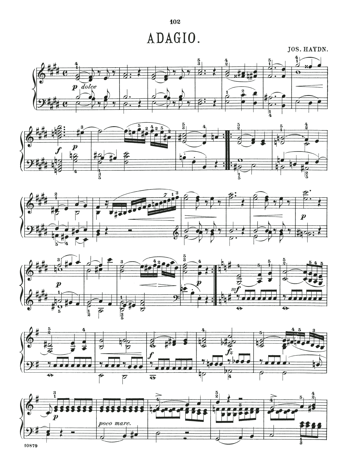 Download or print Franz Joseph Haydn Adagio In E Major sheet music, chords and digital score arranged for Piano Solo. This Classical score includes 2 page(s).
