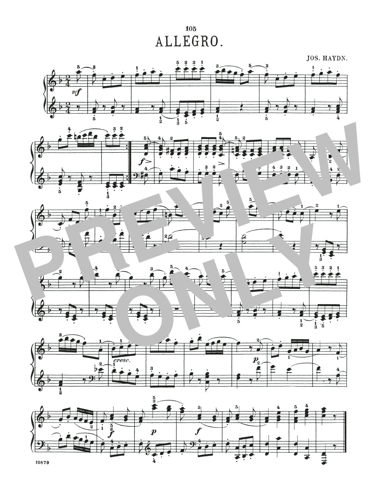 Download or print Franz Joseph Haydn Allegro In F Major sheet music, chords and digital score arranged for Piano Solo. This Classical score includes 1 page(s).