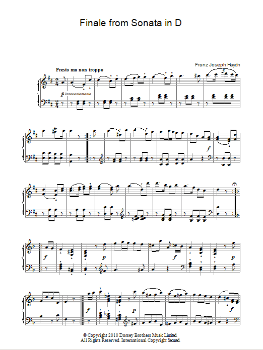 Download or print Franz Joseph Haydn Finale From Sonata In D sheet music, chords and digital score arranged for Piano Solo. This Classical score includes 4 page(s).