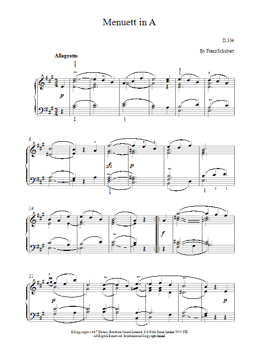 Download or print Franz Schubert Menuett In A sheet music, chords and digital score arranged for Piano Solo. This Classical score includes 3 page(s).