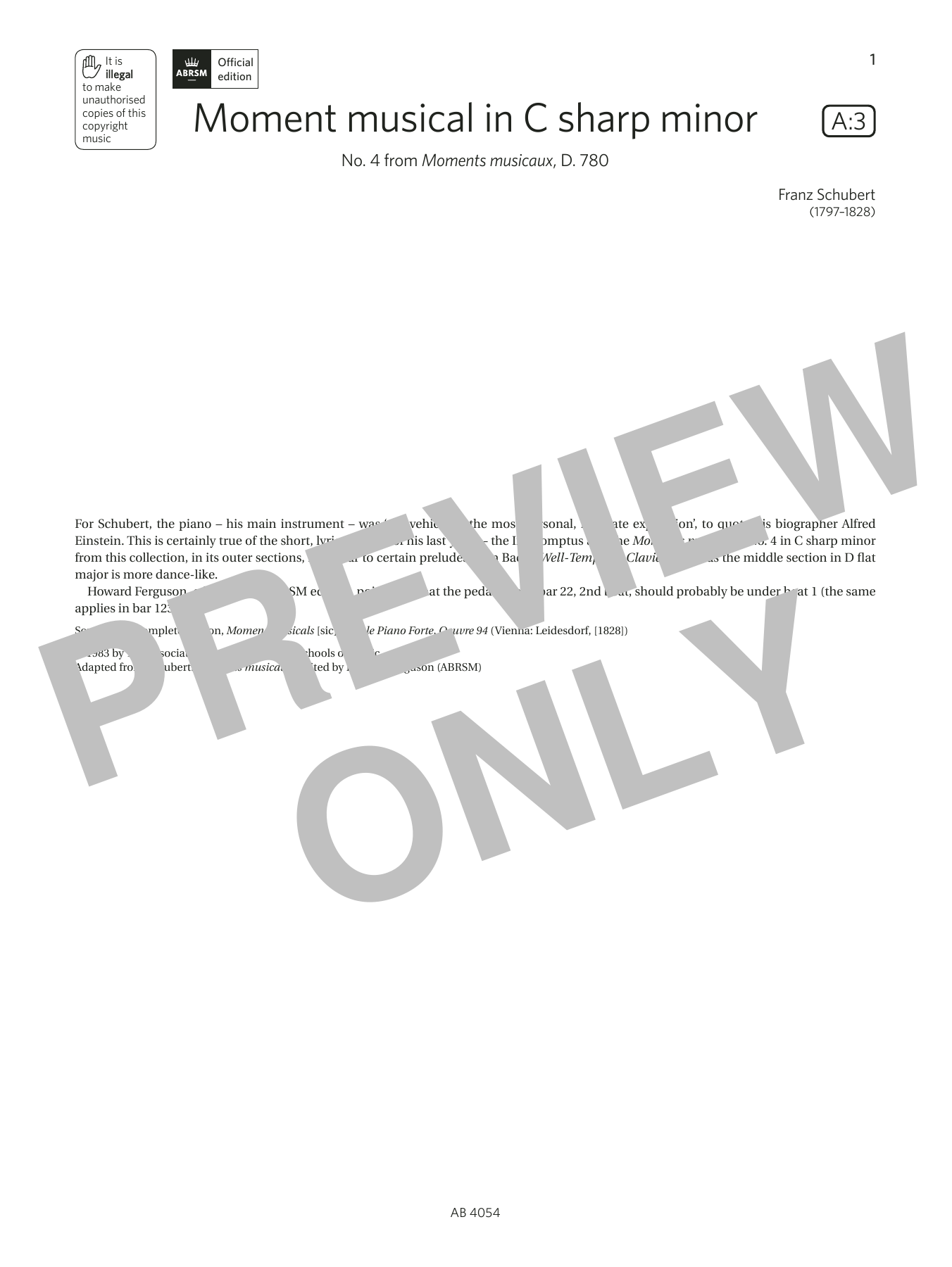 Quick facts Moment musical in C sharp minor (Grade 8, list A3, from the ABRSM Piano Syllabus 2023 & 2024) about digital sheet music