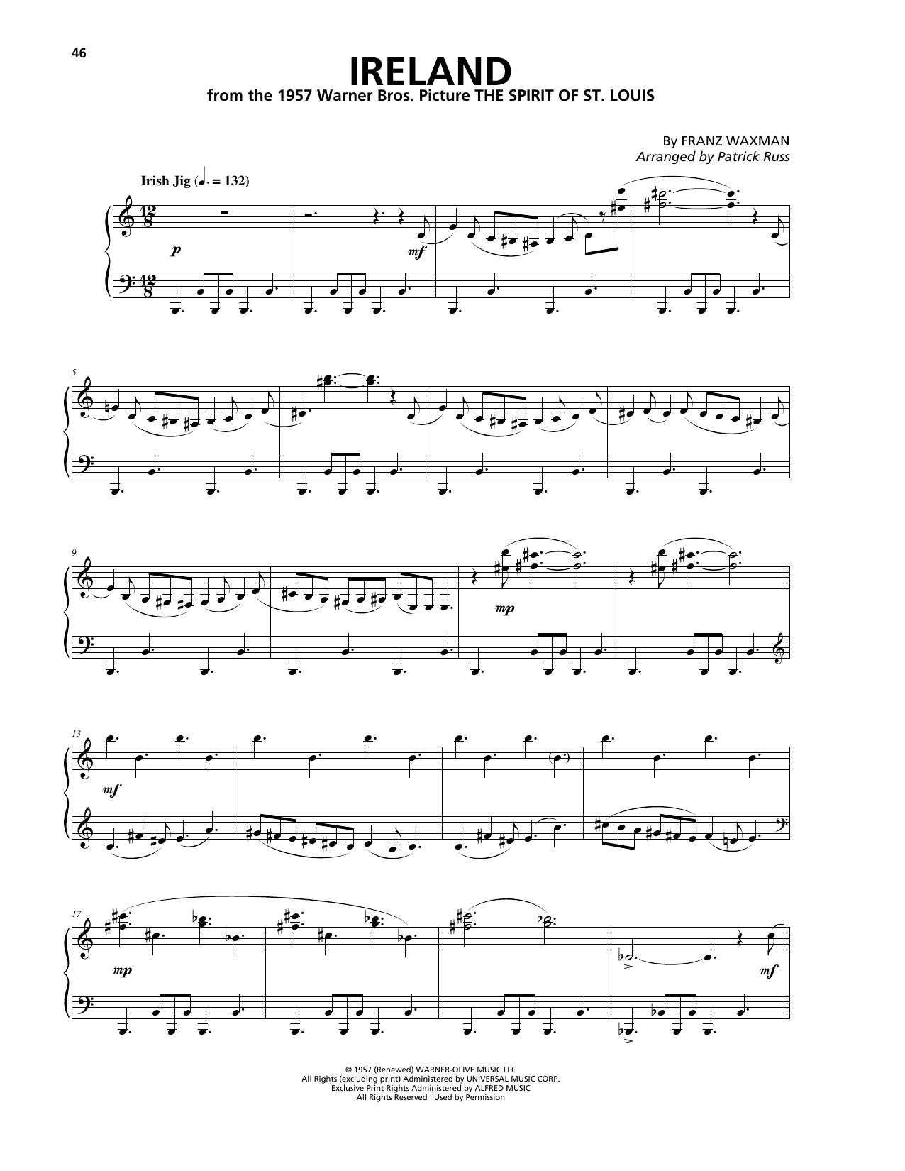 Download or print Franz Waxman Ireland (from The Spirit Of St. Louis) sheet music, chords and digital score arranged for Piano Solo. This Film/TV score includes 2 page(s).