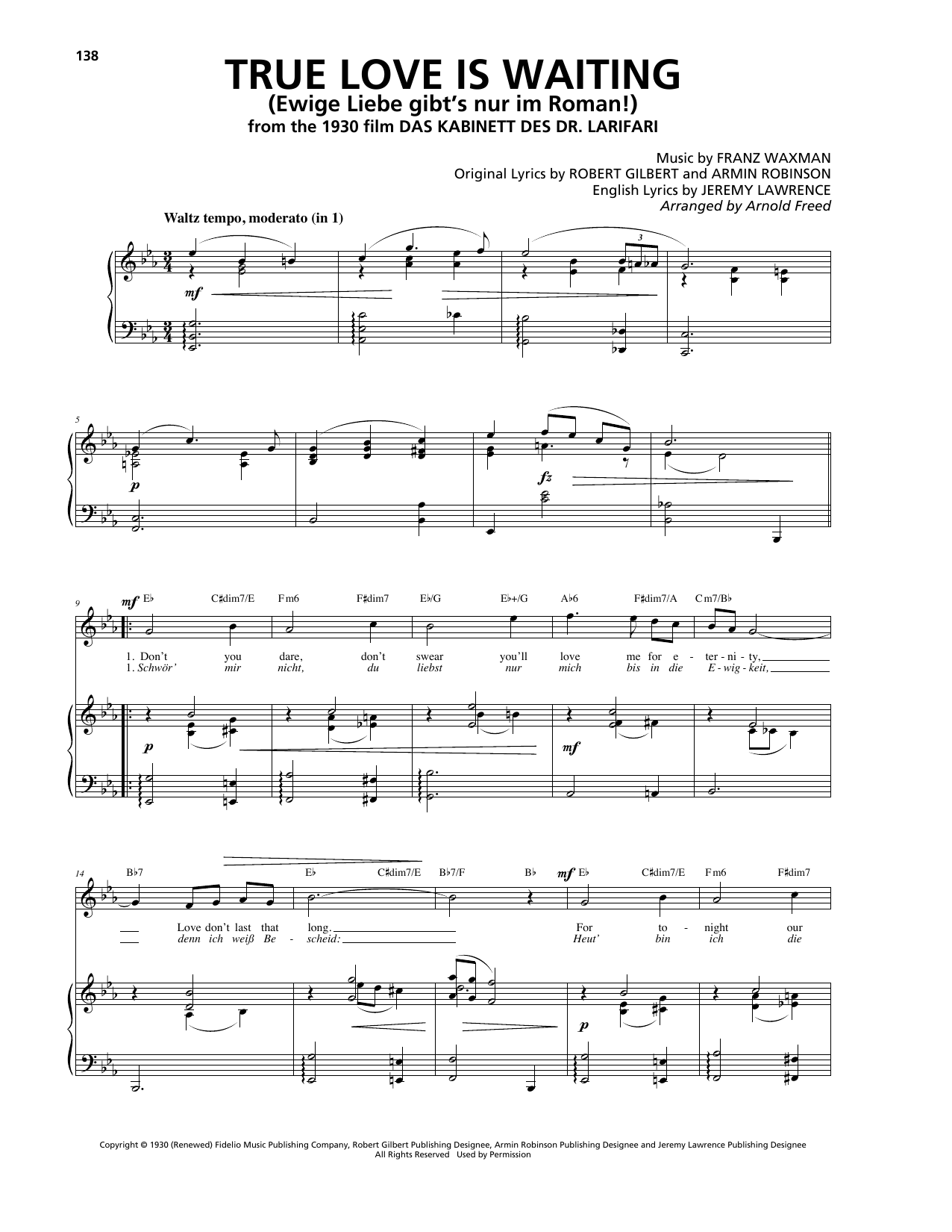 Download or print Franz Waxman True Love Is Waiting (Ewige Liebe gibt's nur im Roman!) sheet music, chords and digital score arranged for Piano, Vocal & Guitar Chords (Right-Hand Melody). This Film/TV score includes 4 page(s).