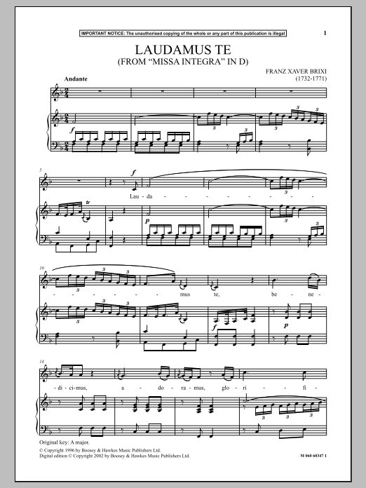 Download or print Franz Xaver Brixi Laudamus Te (from Missa Integra In D) sheet music, chords and digital score arranged for Piano & Vocal. This Classical score includes 5 page(s).