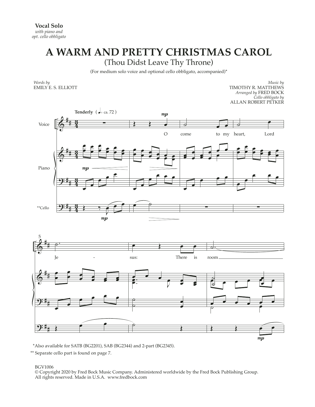 Download or print Fred Bock A Warm And Pretty Christmas Carol (with optional cello obbligato) sheet music, chords and digital score arranged for Piano & Vocal. This Christmas score includes 7 page(s).