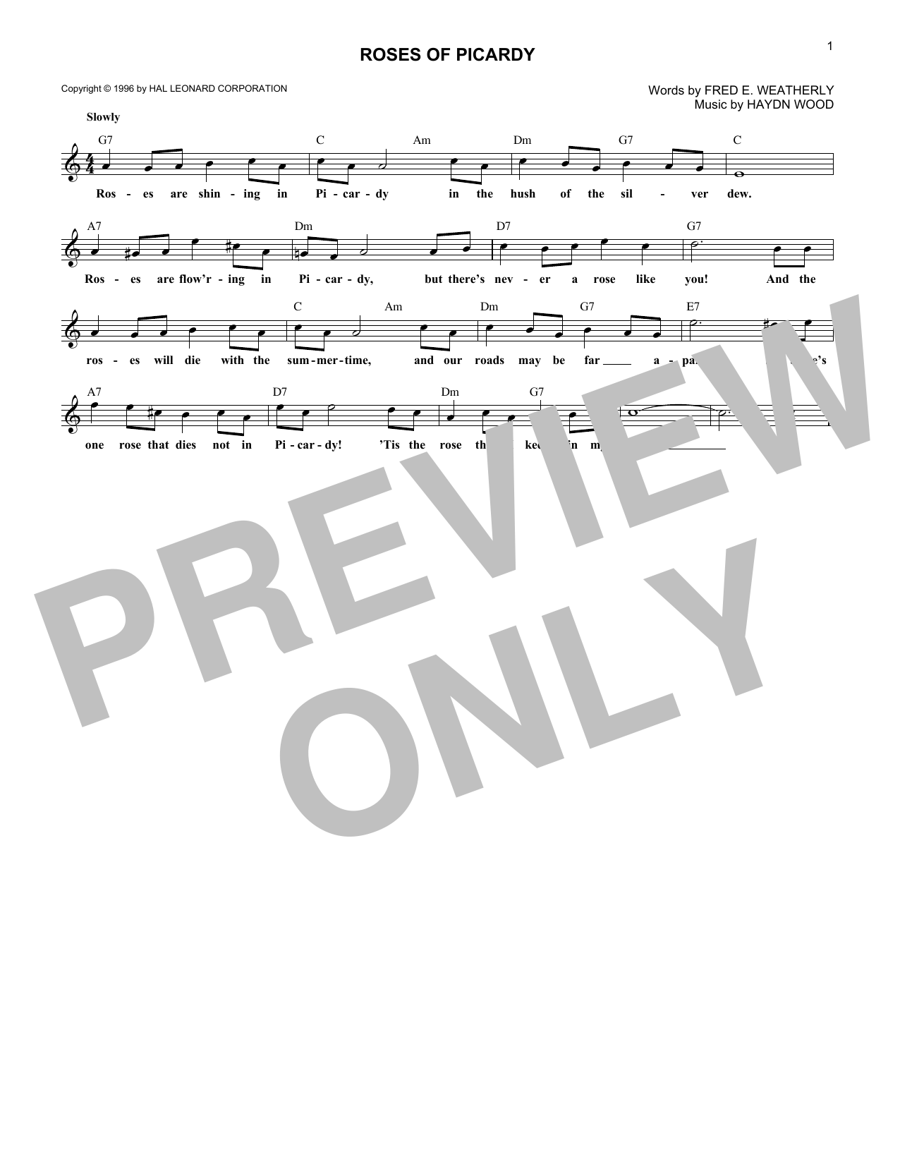 Download or print Fred E. Weatherly Roses Of Picardy sheet music, chords and digital score arranged for Lead Sheet / Fake Book. This Jazz score includes 1 page(s).