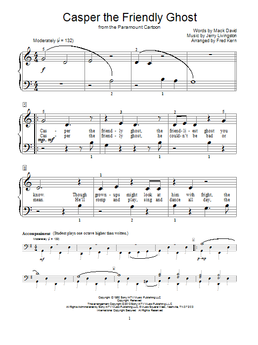 Download or print Fred Kern Casper The Friendly Ghost sheet music, chords and digital score arranged for Educational Piano. This Children score includes 3 page(s).
