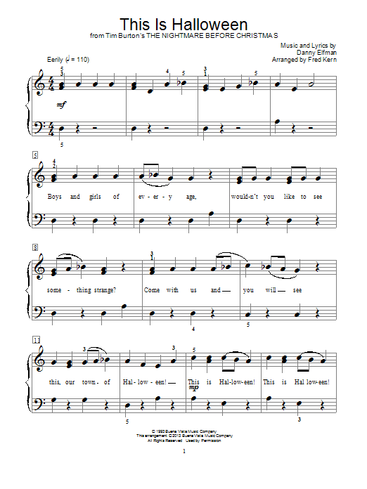 Download or print Fred Kern This Is Halloween (from The Nightmare Before Christmas) sheet music, chords and digital score arranged for Educational Piano. This Children score includes 3 page(s).