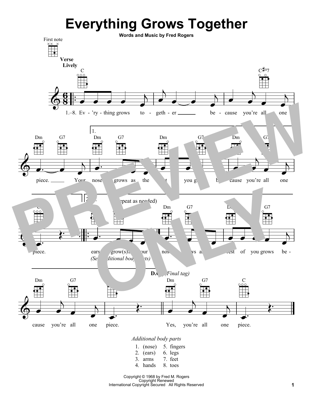 Download or print Fred Rogers Everything Grows Together (from Mister Rogers' Neighborhood) sheet music, chords and digital score arranged for Ukulele. This Children score includes 1 page(s).