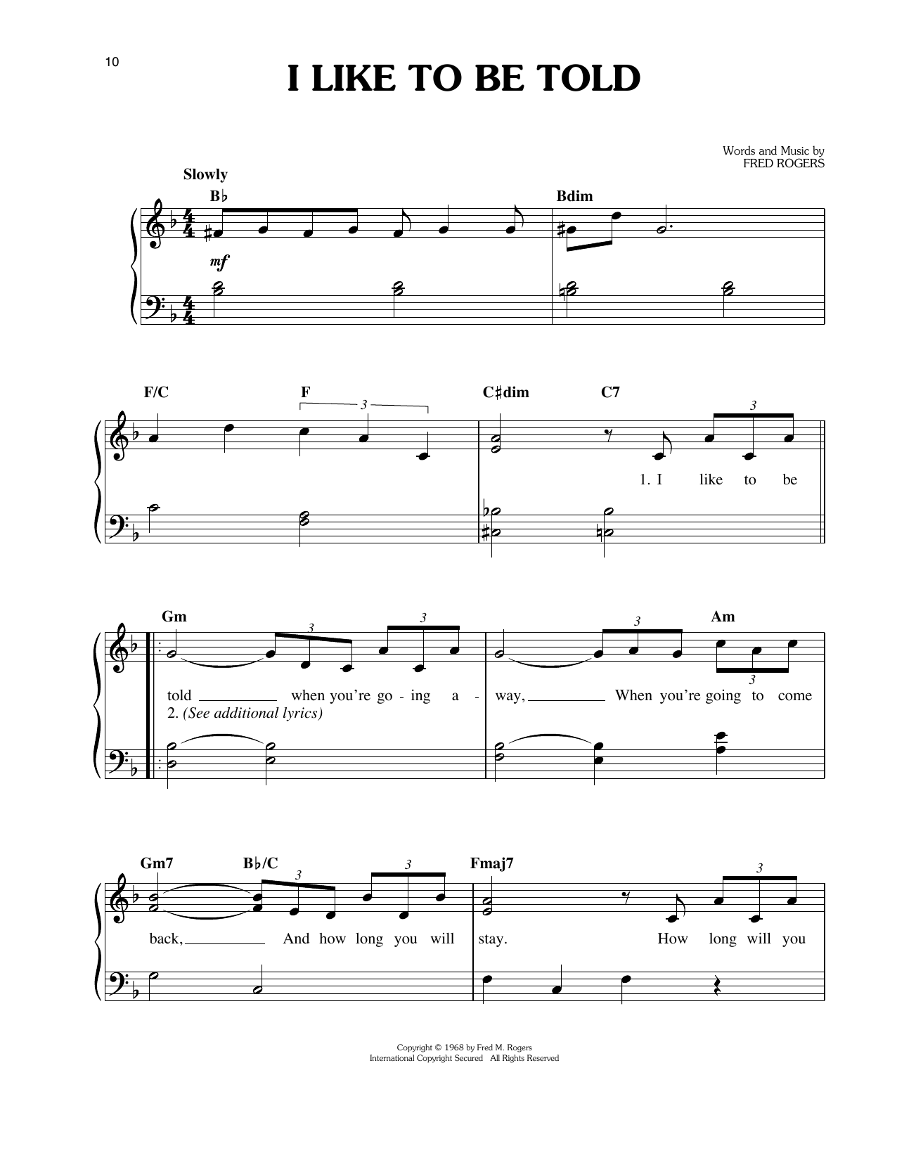 Download or print Fred Rogers I Like To Be Told sheet music, chords and digital score arranged for Easy Piano. This Children score includes 3 page(s).