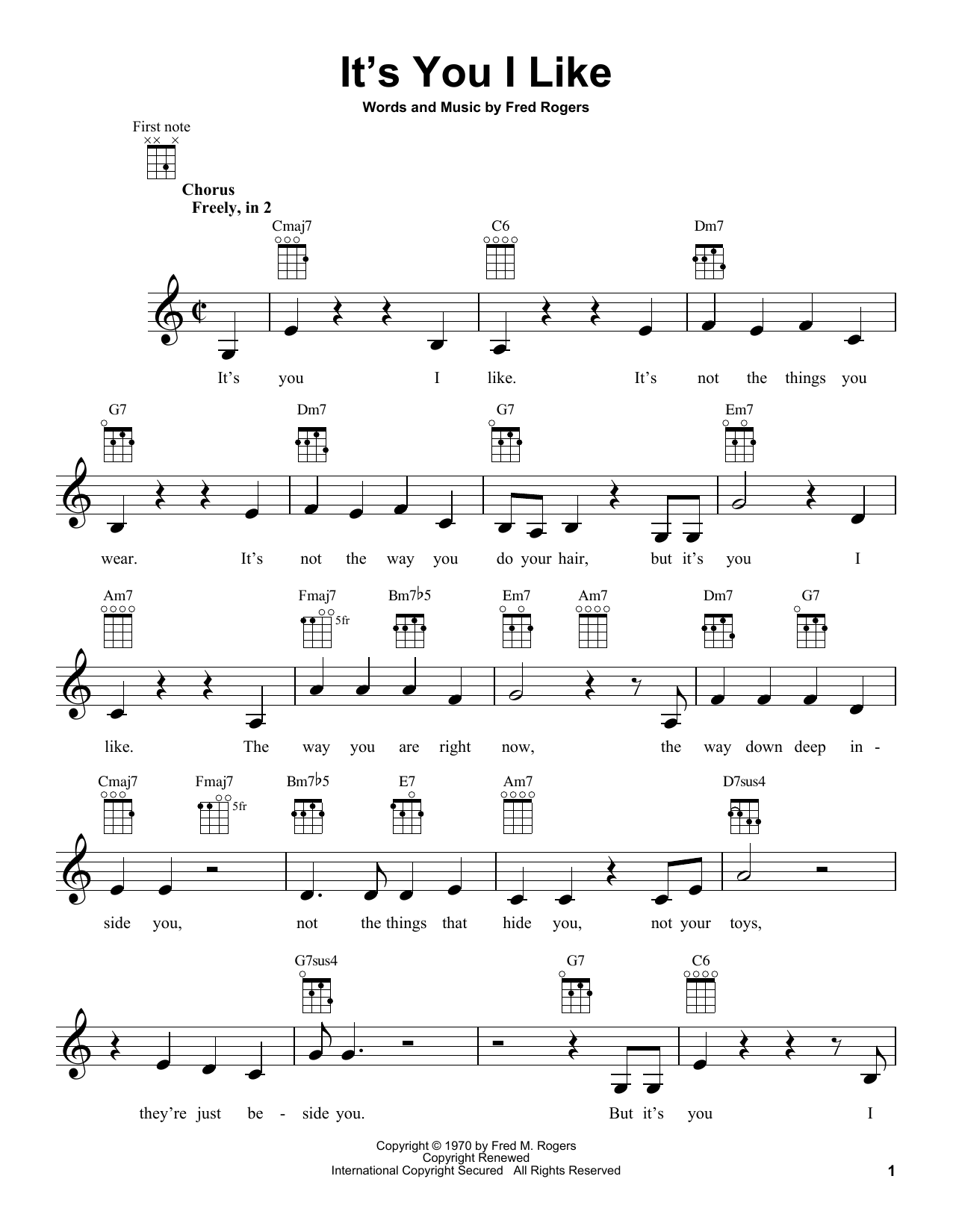Download or print Fred Rogers It's You I Like (from Mister Rogers' Neighborhood) sheet music, chords and digital score arranged for Ukulele. This Children score includes 2 page(s).