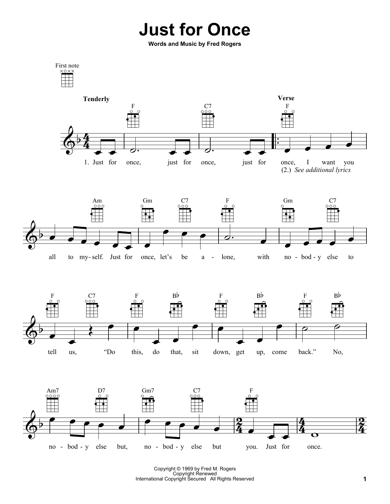 Download or print Fred Rogers Just For Once (from Mister Rogers' Neighborhood) sheet music, chords and digital score arranged for Ukulele. This Children score includes 2 page(s).