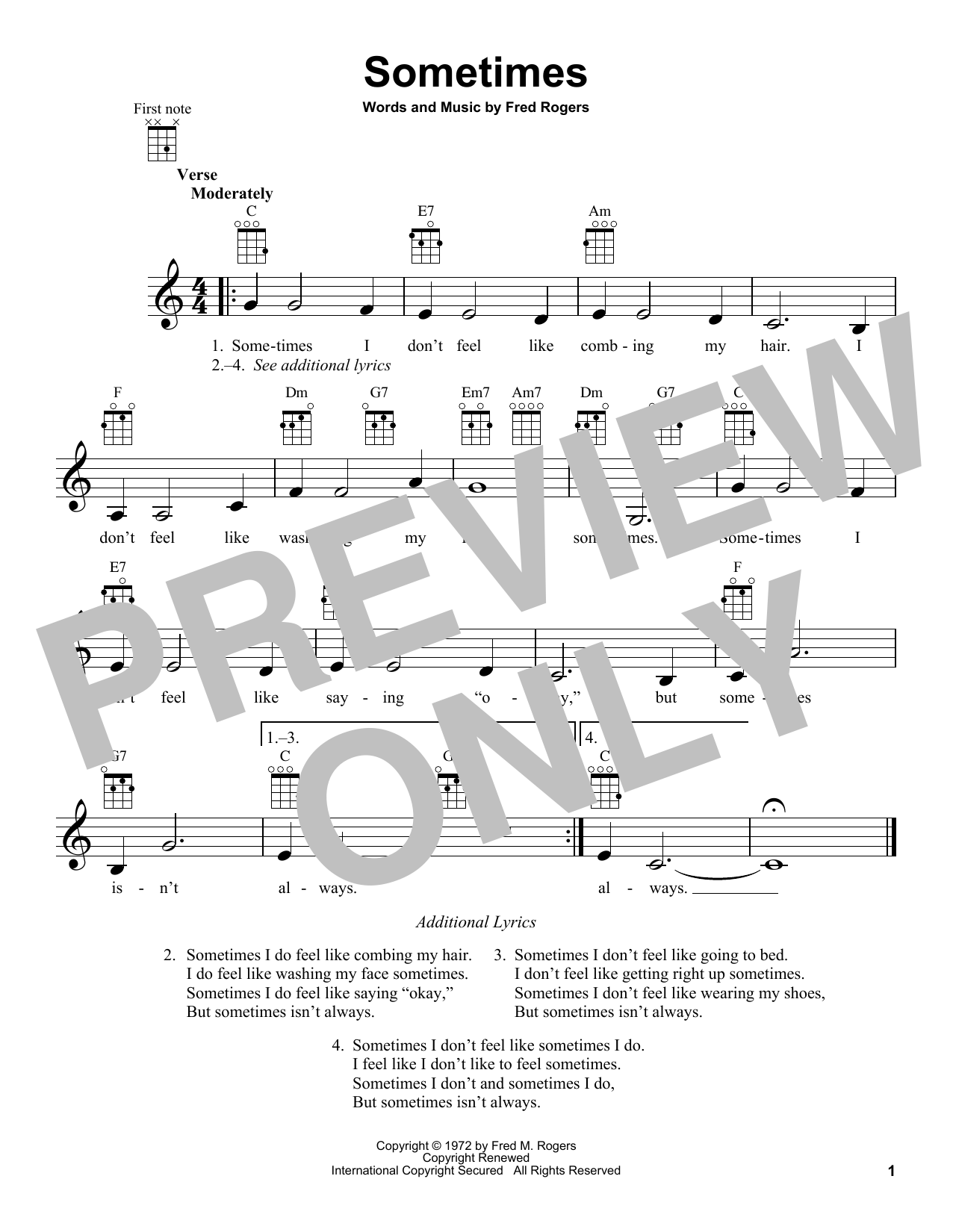 Download or print Fred Rogers Sometimes (from Mister Rogers' Neighborhood) sheet music, chords and digital score arranged for Ukulele. This Children score includes 1 page(s).