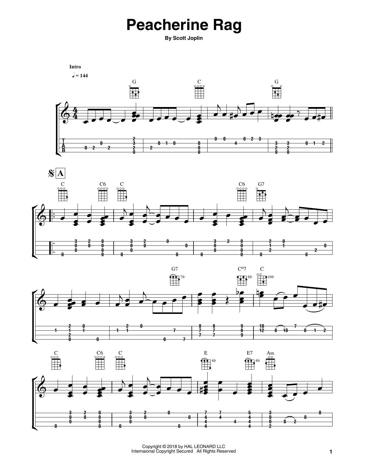 Download or print Scott Joplin Peacherine Rag (arr. Fred Sokolow) sheet music, chords and digital score arranged for Easy Ukulele Tab. This Jazz score includes 5 page(s).