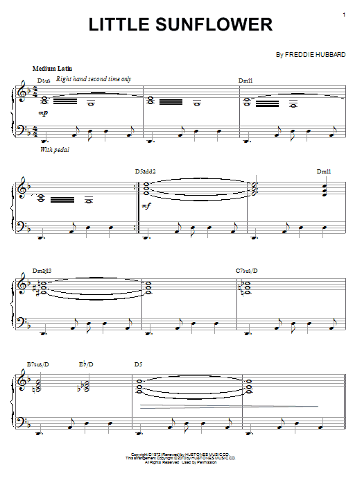 Download or print Freddie Hubbard Little Sunflower (arr. Brent Edstrom) sheet music, chords and digital score arranged for Piano Solo. This Jazz score includes 6 page(s).