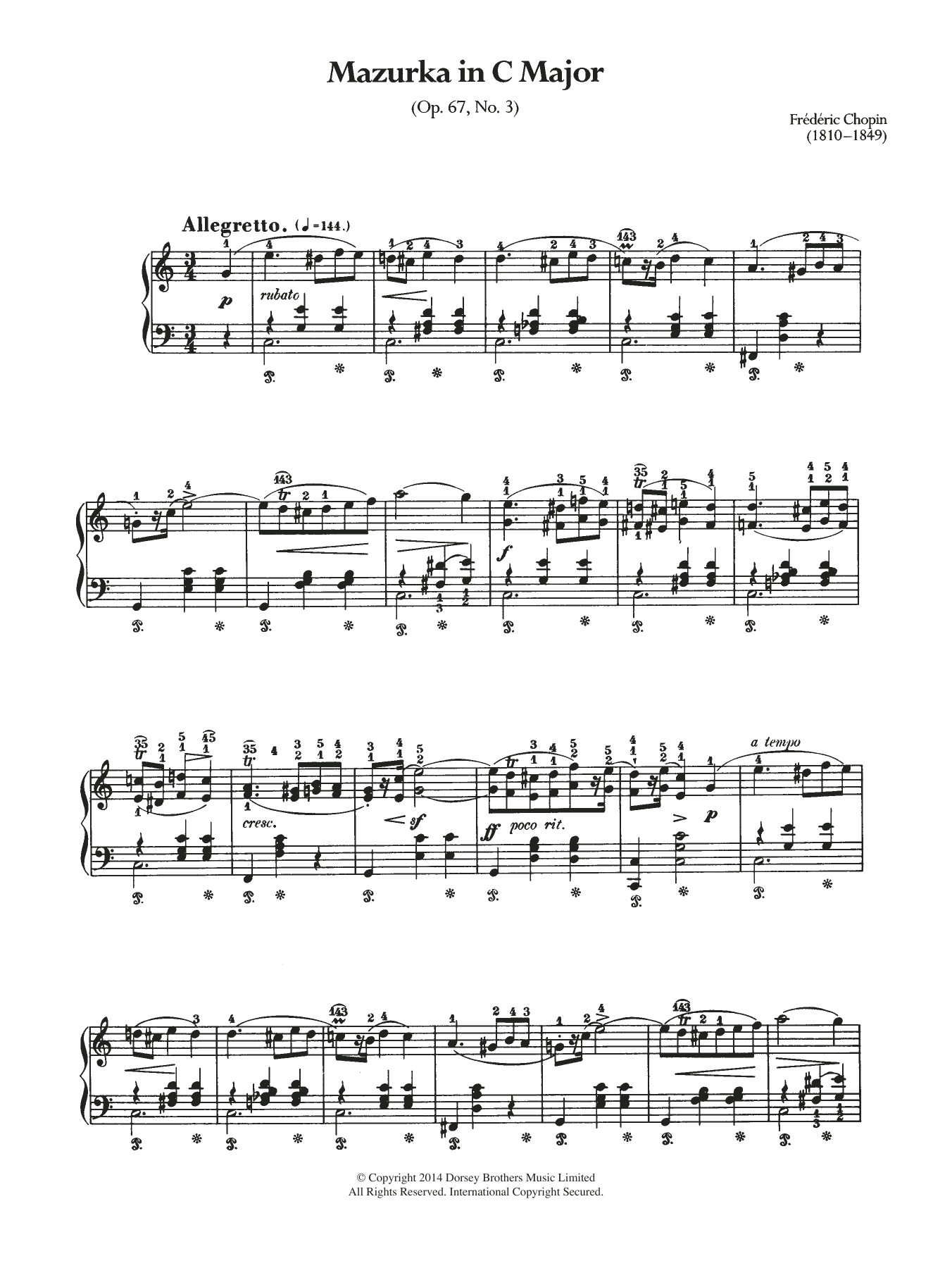 Download or print Frédéric Chopin Mazurka In C Major, Op.67 No.3 sheet music, chords and digital score arranged for Piano Solo. This Classical score includes 2 page(s).