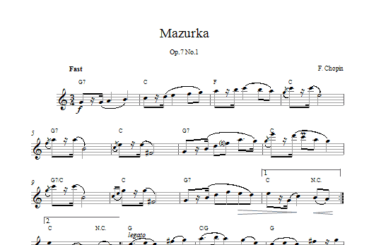 Download or print Frédéric Chopin Mazurka Op.7, No.1 sheet music, chords and digital score arranged for Flute Solo. This Classical score includes 2 page(s).