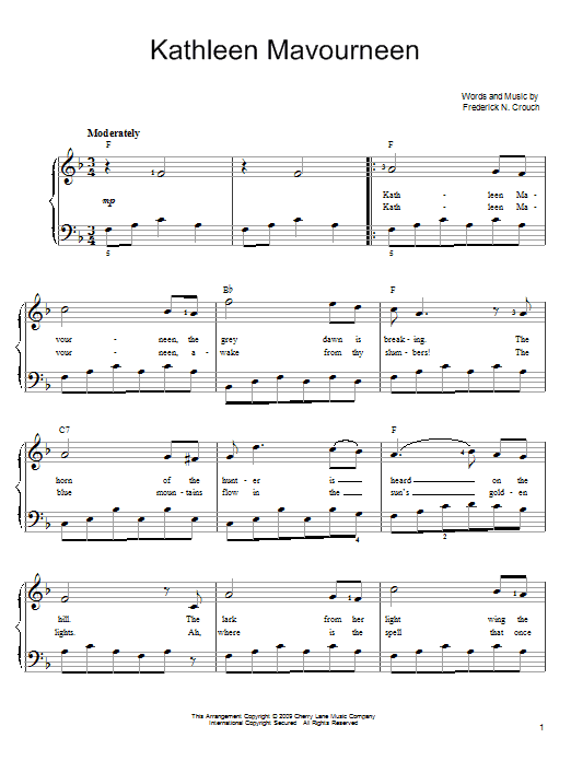 Download or print Frederick N. Crouch Kathleen Mavoureen sheet music, chords and digital score arranged for Easy Piano. This Irish score includes 3 page(s).