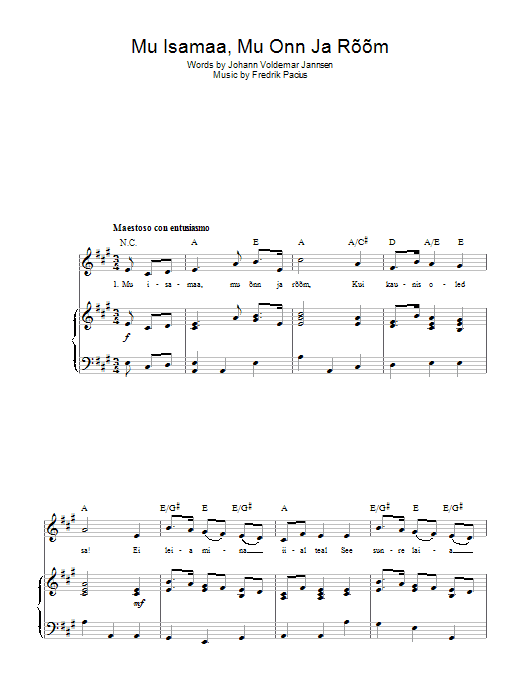 Download or print Fredrik Pacius Mu Isamaa, Mu Onn Ja Room (Estonian National Anthem) sheet music, chords and digital score arranged for Piano, Vocal & Guitar Chords. This Inspirational score includes 2 page(s).