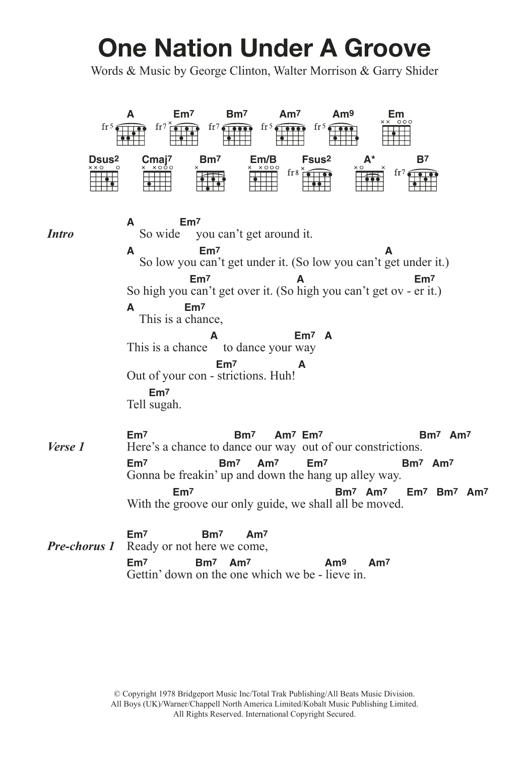 Download or print Funkadelic One Nation Under A Groove sheet music, chords and digital score arranged for Guitar Chords/Lyrics. This Soul score includes 5 page(s).