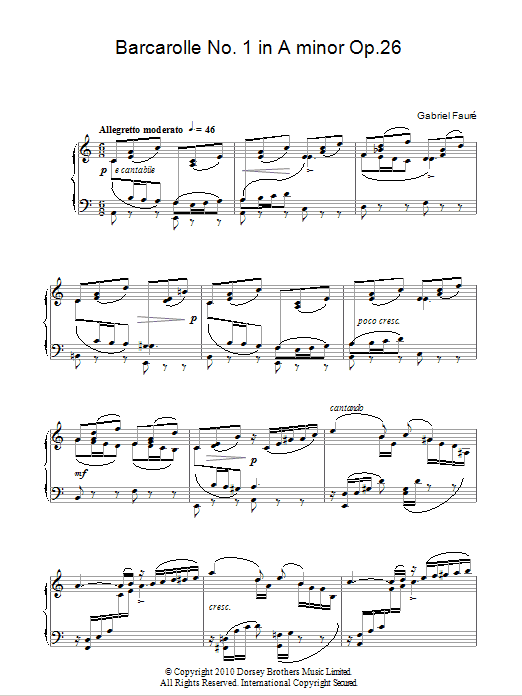 Download or print Gabriel Faure Barcarolle No. 1 In A Minor, Op. 26 sheet music, chords and digital score arranged for Piano Solo. This Classical score includes 3 page(s).