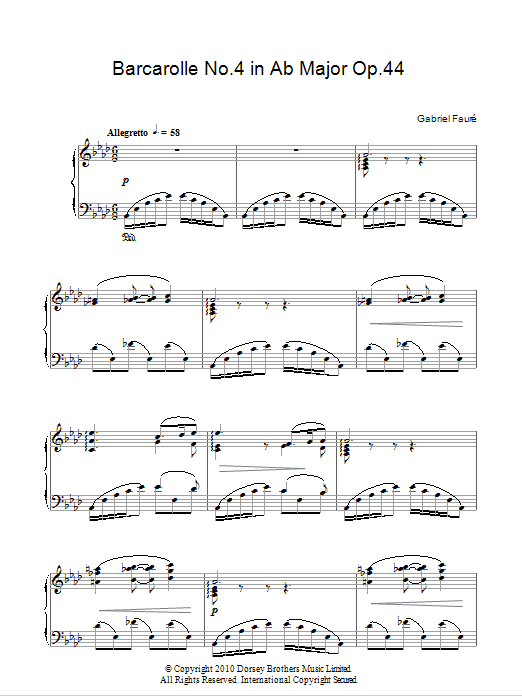 Download or print Gabriel Faure Barcarolle No. 4 In A Flat Major, Op. 44 sheet music, chords and digital score arranged for Piano Solo. This Classical score includes 9 page(s).