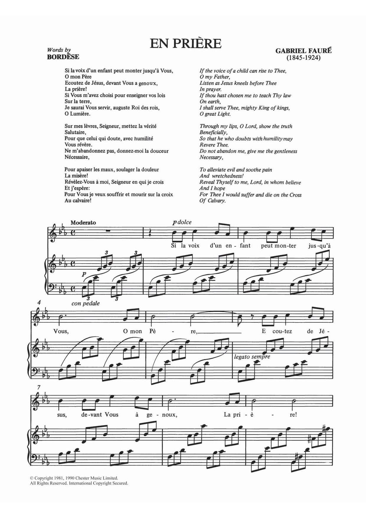 Download or print Gabriel Fauré En Priere sheet music, chords and digital score arranged for Piano & Vocal. This Classical score includes 4 page(s).