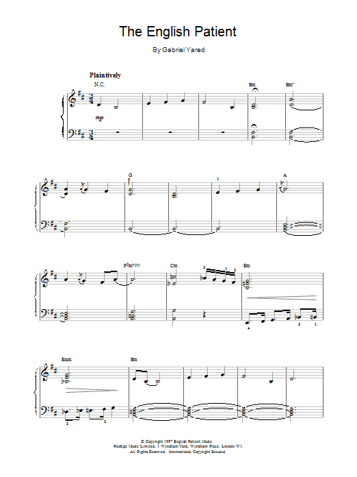 Download or print Gabriel Yared The English Patient sheet music, chords and digital score arranged for Piano Solo. This Film/TV score includes 3 page(s).