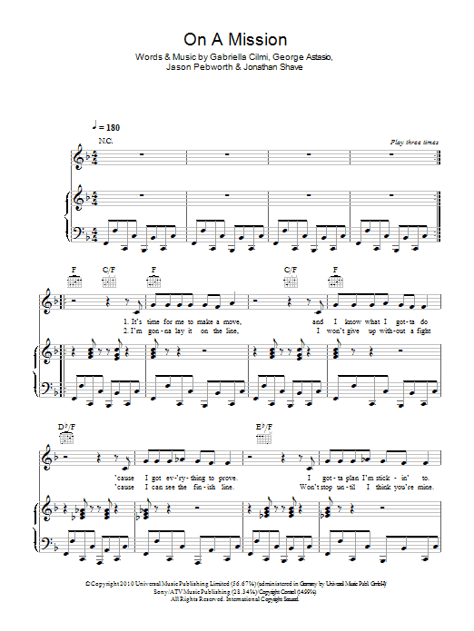 Download or print Gabriella Cilmi On A Mission sheet music, chords and digital score arranged for Piano, Vocal & Guitar Chords. This Pop score includes 6 page(s).