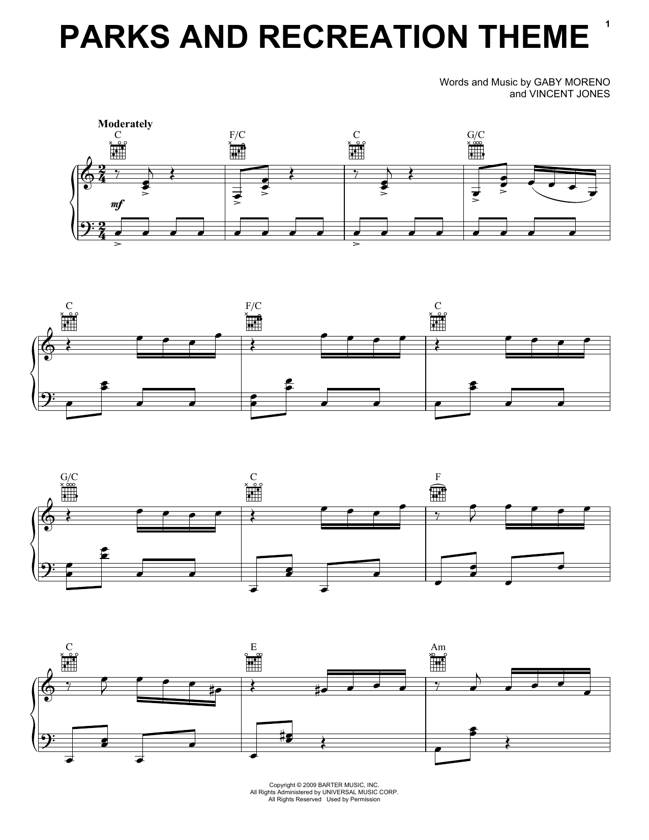 Download or print Gaby Moreno and Vincent Jones Parks And Recreation Theme sheet music, chords and digital score arranged for Piano Solo. This Film/TV score includes 2 page(s).