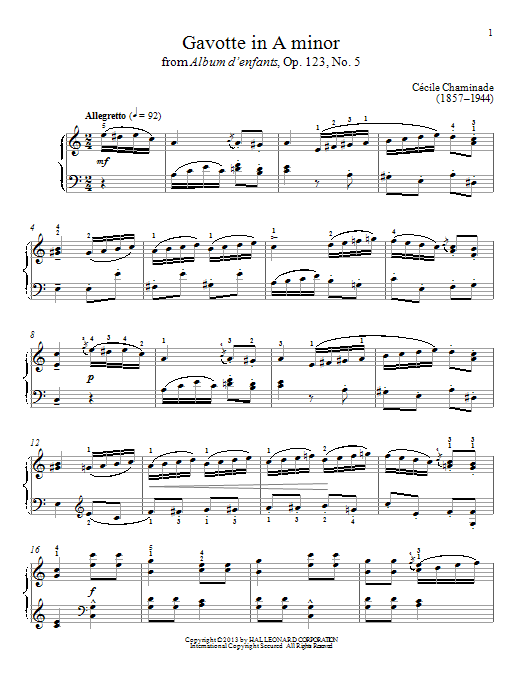 Download or print Cecile Chaminade Gavotte In A Minor sheet music, chords and digital score arranged for Piano Solo. This Classical score includes 2 page(s).
