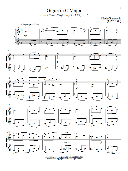 Download or print Cecile Chaminade Gigue In C Major sheet music, chords and digital score arranged for Piano Solo. This Classical score includes 2 page(s).