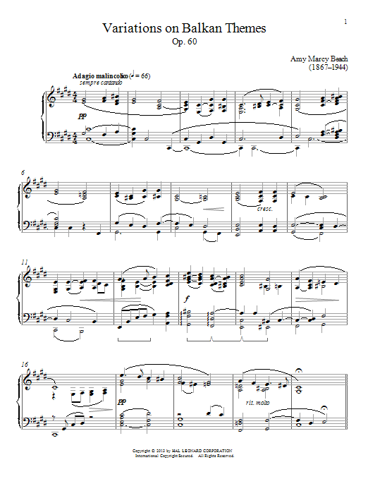 Download or print Amy Beach Variations On Balkan Themes, Op. 60 sheet music, chords and digital score arranged for Piano Solo. This Classical score includes 24 page(s).