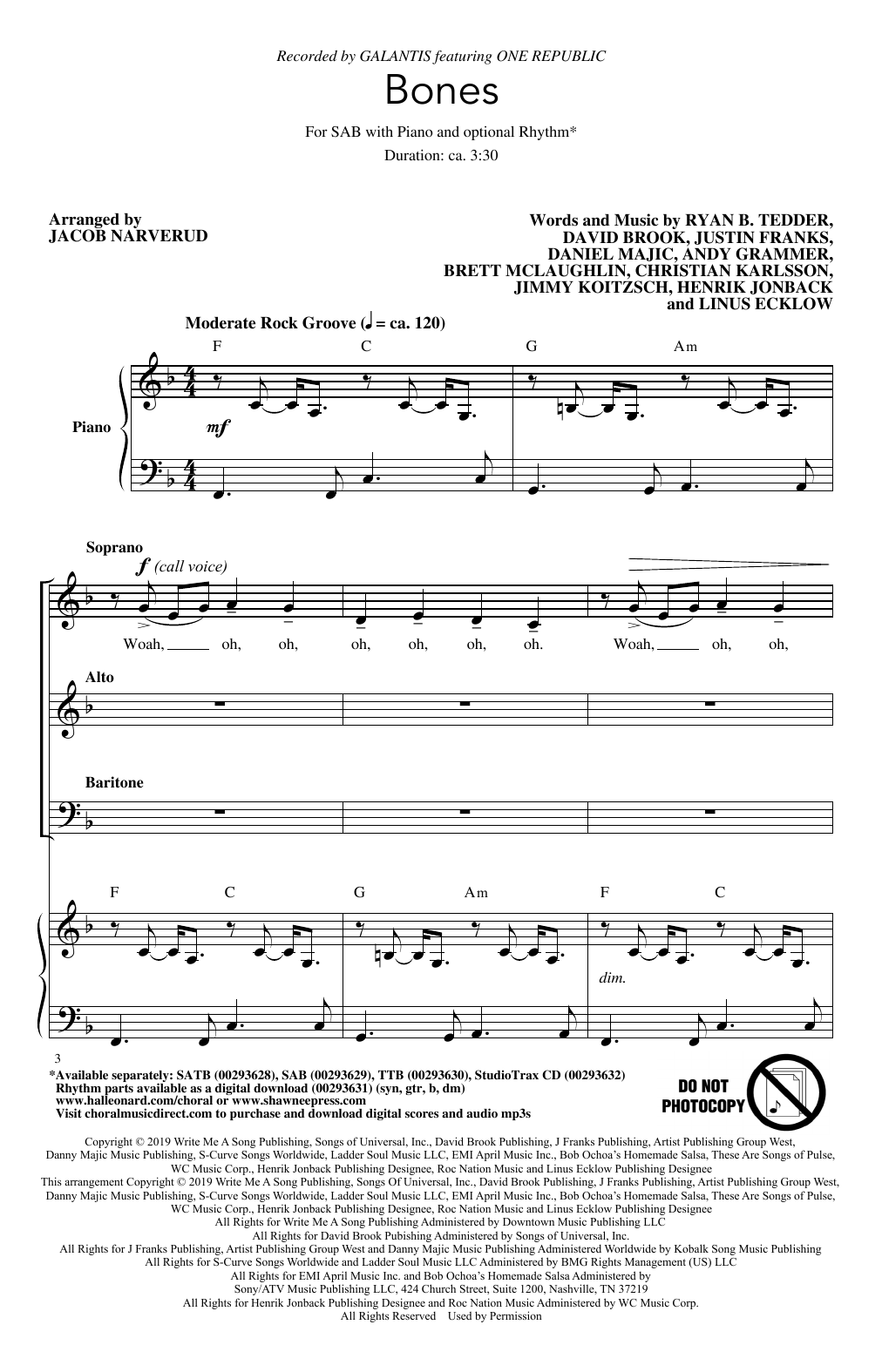 Download or print Galantis Bones (feat. OneRepublic) (arr. Jacob Narverud) sheet music, chords and digital score arranged for SAB Choir. This Pop score includes 23 page(s).