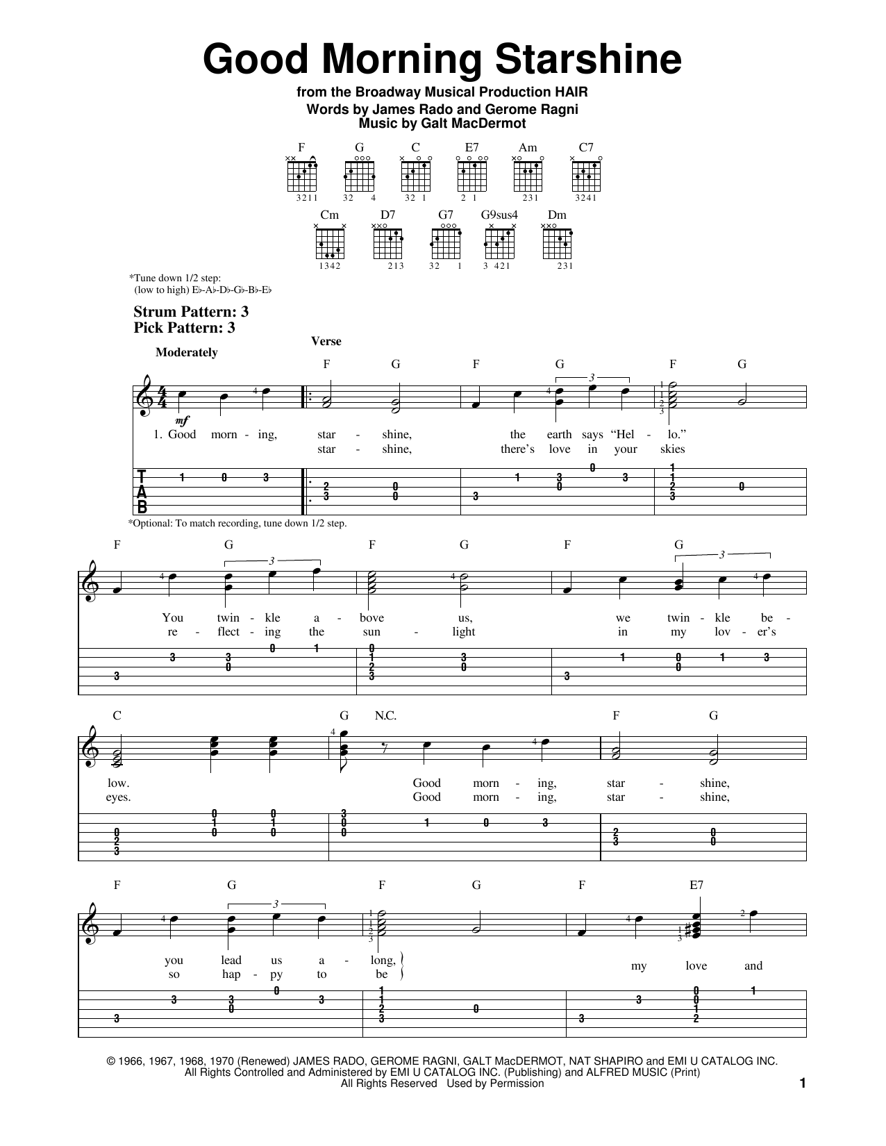 Download or print Galt MacDermot Good Morning Starshine (from 'Hair') sheet music, chords and digital score arranged for Big Note Piano. This Broadway score includes 4 page(s).