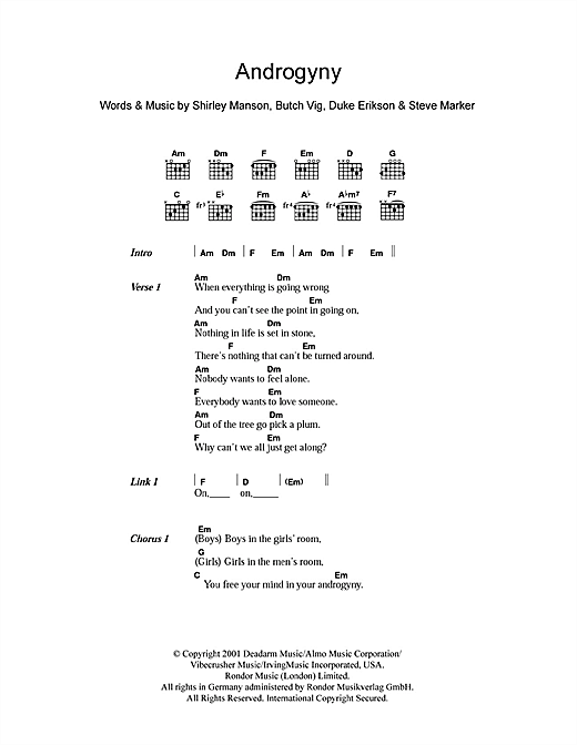 Download or print Garbage Androgyny sheet music, chords and digital score arranged for Guitar Chords/Lyrics. This Rock score includes 3 page(s).