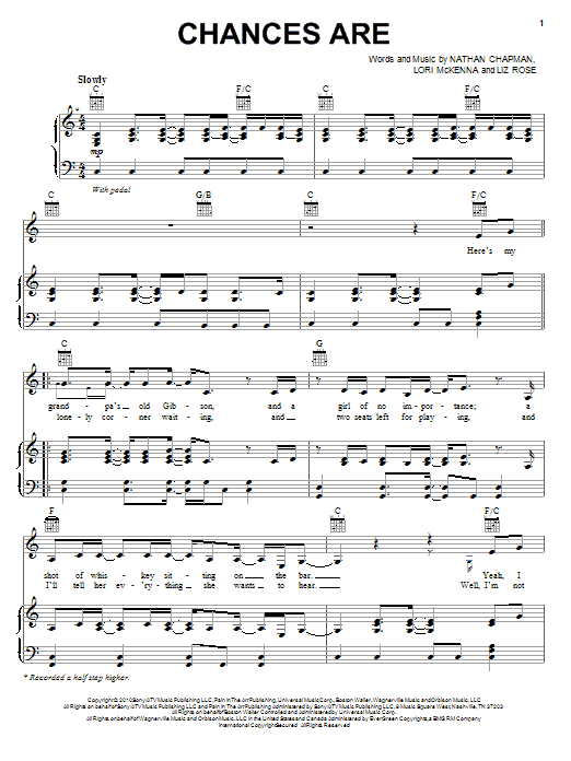 Download or print Garrett Hedlund Chances Are sheet music, chords and digital score arranged for Piano, Vocal & Guitar Chords (Right-Hand Melody). This Country score includes 4 page(s).