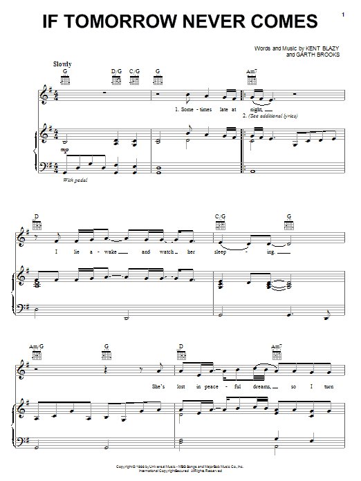 Download or print Garth Brooks If Tomorrow Never Comes sheet music, chords and digital score arranged for Piano, Vocal & Guitar Chords (Right-Hand Melody). This Country score includes 5 page(s).