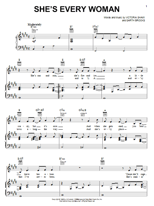 Download or print Garth Brooks She's Every Woman sheet music, chords and digital score arranged for Piano, Vocal & Guitar Chords (Right-Hand Melody). This Country score includes 5 page(s).