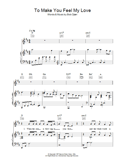 Download or print Garth Brooks To Make You Feel My Love sheet music, chords and digital score arranged for Piano, Vocal & Guitar Chords (Right-Hand Melody). This Pop score includes 5 page(s).
